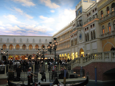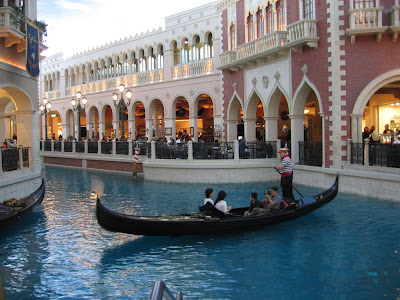 酒店底层是赌博大厅,人工河在二楼的购物餐饮区。这里的层高有十几米,装饰成统一的楼中楼风格,要在室内再现威尼斯黄昏时分的街景。我们没有看过真正的威尼斯,故不能得知这里的建筑是不是在那里都能找到原型。不少游客排队乘坐刚朵拉游船,船夫会为乘客高歌一曲, 成人票价12元,倒不算贵,不过这始终是仿制品,不如以后有机会去威尼斯体验正品。