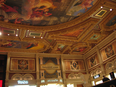 威尼斯人没有让我们失望,这个人工河以及模仿傍晚天空的天花板设计着实新颖有趣。整个酒店的整体装修就十分考究,入口处高高的天花板上绘满了欧陆文艺复兴风格的壁画,通常这样的壁画,主题都来自于圣经或是希腊罗马的神话故事,神氏们高高在上,俯视大厅里的纸醉金迷。