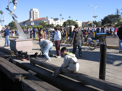 本来打算27号去海洋世界,由于动物园让我们很失望,大家怀疑海洋世界也没啥好看,于是临时决定乘船出海观鲸鱼。考虑到可能又要排队,为了赶上早上9:30的早场,我们还是兵分两路:海伦,老公和我先行出发去买票。人算不如天算,到了海港路我们才发现不知有什么重大的活动,海港附近在搞路禁,根本无法停车。最后,我们这一路倒是按时买好票,停好车,大平他们被车流困住了,只有等下午1:30的船了。原来,我们赶上的是圣地亚哥一年一度的气球节游行,游行队伍拉着造型各异的氦气球招摇过市。不少队伍都有乐队助兴,有的甚至还弄了马队或是驼马队,好不热闹。我们待在游轮码头附近,正好有当地的电台在现场直播,可以听到免费解说,原来这些游行队伍来自全美各地,甚至还有法轮功教众。俺对法轮功就没有好映像,看见他们坐在莲花座上装模作样就气不打一处来。