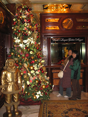 Golden nugget算是维加斯老牌的酒店了,这个酒店的风格如它的名字一样“金碧辉煌”,满眼都是黄灿灿的颜色。下面第二张照片里,海伦脑袋旁边的橱窗里就是这家酒店的镇店之宝——世界上最大的天然金块了。
