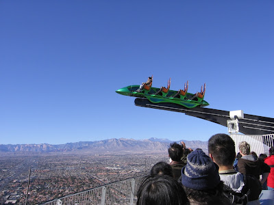 塔顶上搭建了3个游艺装置,号称是世界第一第二第三高的机动游戏设备,把地面上的惊恐游艺设备搬到两百多米的高空中,的确算是个不错的创意。看见一个印度mm一个人玩x scream, 实在是勇气可嘉,这个设施的轨道有一部分伸出了塔顶平台,轨道车下倾的停在轨道顶端时,我们看着都觉得揪心,她却满不在乎的笑着摆pose 照相。最高的设备即是塔尖上的“急速下降”,顶端高达350米,名叫the big shot,其实不用搬到塔顶,本身大几十米高的急速下降已经够惊悚的了。另外一个八爪鱼型的insanity the ride,没看见有人光顾,看见它全敞式的座椅,我就开始冒冷汗了,据说原来还有一组过山车,在05年停运。
