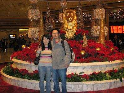 稍作调整后,我们出门去逛strip。同温层在strip的最北端,离繁华有那么几站轻轨的距离。我们走到轻轨的起始站撒哈拉酒店,打算先乘车到美高美大酒店,再步行把附近一家家酒店逛过。此行我最失算的地方就是听信了老公的假信息没带厚外套,拉斯维加斯的12月,不比咱林肯天气好的时候暖和。太阳落山也早,到了6点,就可以看夜景了,当然夜景更有利于展现strip两边林立的豪华酒店的光怪陆离、纸醉金迷。不管是坐轻轨还是吃饭,任何跟LV相关的事情都得穿越赌场大厅一望无垠的老虎机,一开始还左右看看新鲜,后来就烦透了。我们又高估了自己行路能力,看完美高美的招牌——活狮子,走到Luxor观摩了一下埃及巨像,寒风中我们意识到再不填饱肚子,就赶不及晚上看秀了。